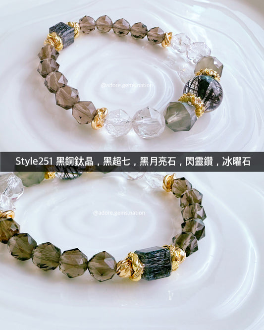 【#明月設計手鏈 Style251】#SuperSeven #黑銅鈦晶 #黑月亮石 #閃靈鑽 #冰曜石 #StarCut