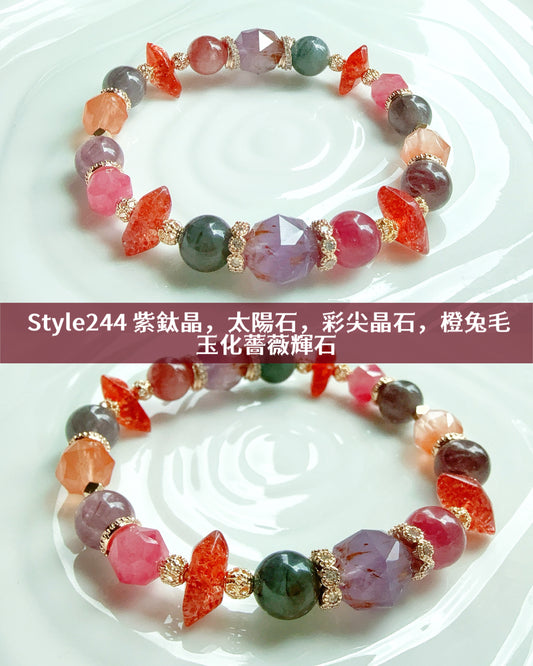 【#明月設計手鏈 Style244】 #紫鈦晶 #太陽石#尖晶石 #橙兔毛水晶#玉化薔薇輝石